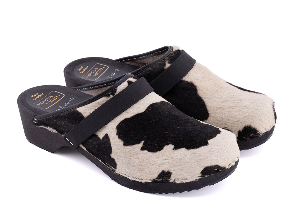 Indy är en träsko som kombinerar traditionellt hantverk med en djärv och stilren design. Tillverkad i äkta läder med infärgad kopäls i klassiskt svart och vitt, ger denna modell en distinkt och exklusiv look.